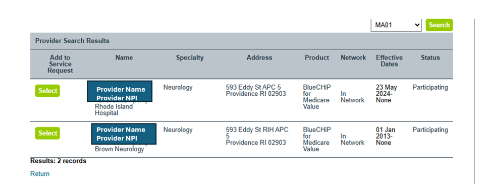 If a provider works for Rhode Island Hospital and Brown Neurology, a list of all the provider’s groups and locations will appear when the PCP office/staff enters the referral.