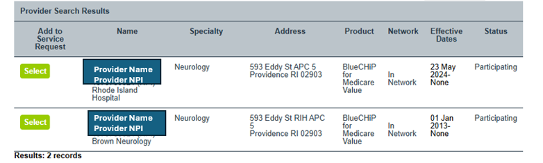 If a provider works for Rhode Island Hospital and Brown Neurology, a list of all the provider’s groups and locations will appear when the PCP office/staff enters the referral.